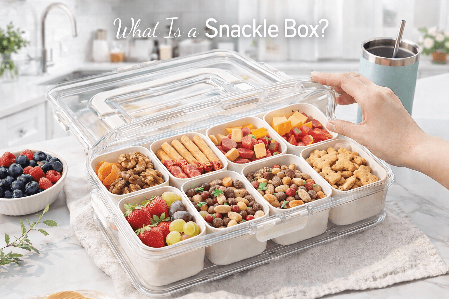 A snackle box is a divided food container that holds several snacks in one place. Each section keeps foods separate, so flavors do not mix. People use it to pack snacks for kids, workdays, travel, and long drives because it saves time and cuts down on mess.