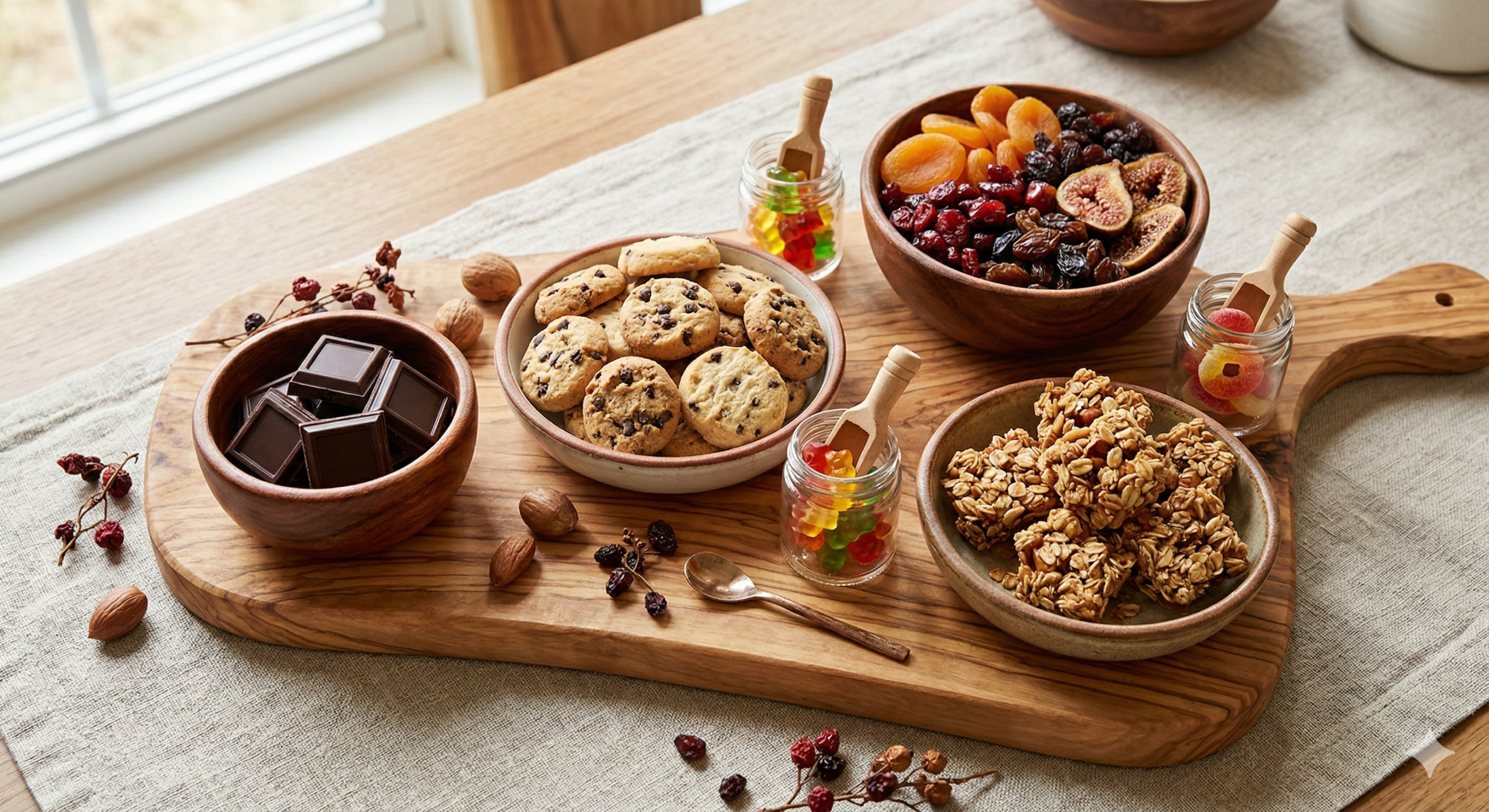 Dark chocolate, small cookies, dried fruit