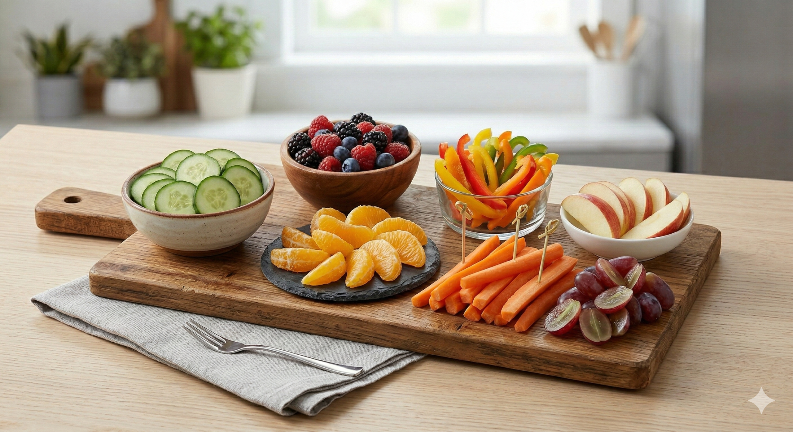 Apple slices, berries, carrots, cucumbers